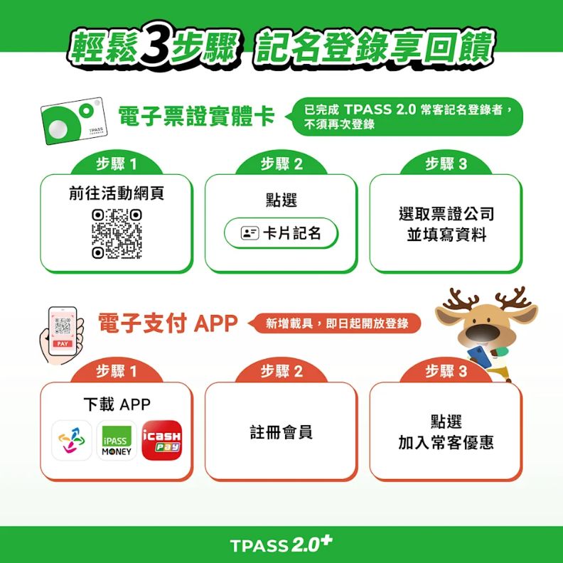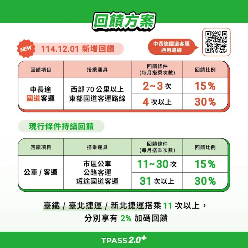 交通部12月1日起,推出「TPASS 2.0+」常客優惠方案,針對西部70公里以上及東部國道客運,共91條中長途國道客運路線,每月搭乘滿2次,可享15%乘車金回饋;每月搭乘滿4次,可享30%乘車金回饋(最高回饋),其餘大眾運輸工具乘車方式,依原有回饋條件進行。