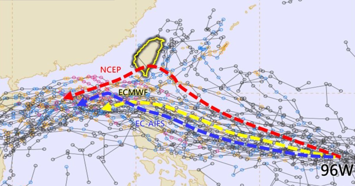 熱帶擾動96W預估將在週末生成為第24號颱風「風神」(Fengshen),氣象專家指出,各國預測路徑仍相當分歧,其中美國NCEP模式預測恐侵襲台灣,不論是否登陸